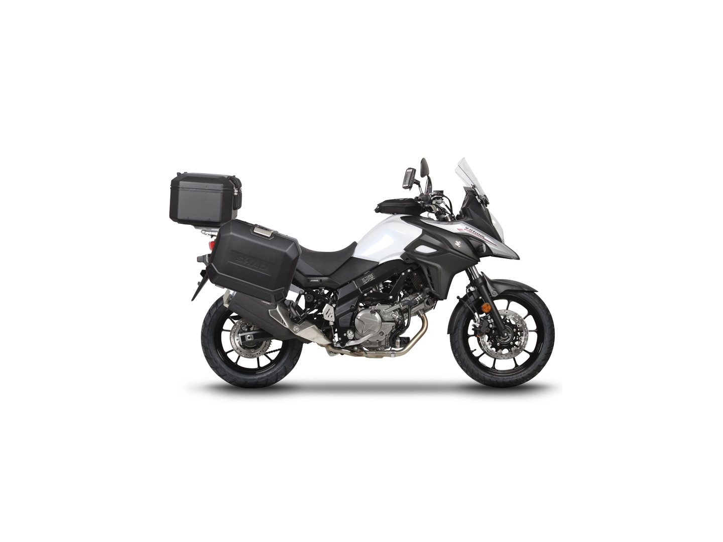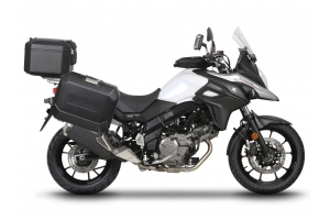 Kompletná sada čiernych hliníkových kufrov SHAD TERRA BLACK , 37 litrov vrchný kufor, 36/36 litrov bočné kufre, vrátane montážnej sady a platni SHAD SUZUKI DL 650 V-Strom
