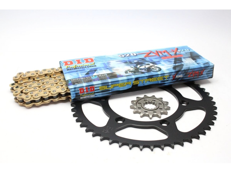 Řetězová sada - Řetěz D.I.D, řady ZVM-X ve zlaté barvě, těsněný X-Kroužkem. Ocelové kolečko a rozeta JT.