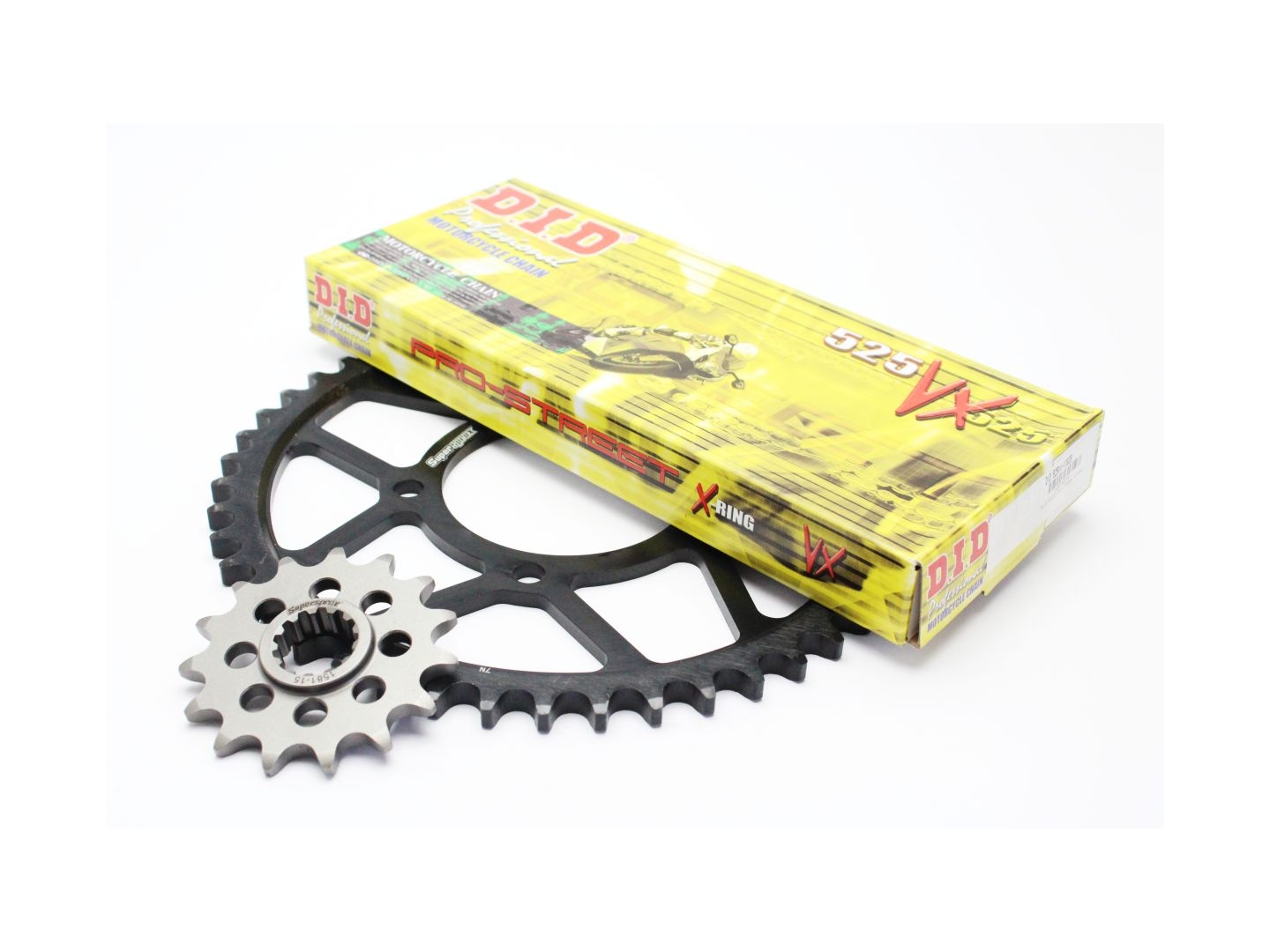 Řetězová sada - Řetěz D.I.D, řady VX, těsněný X-Kroužkem. Ocelové kolečko a rozeta SUPERSPROX.