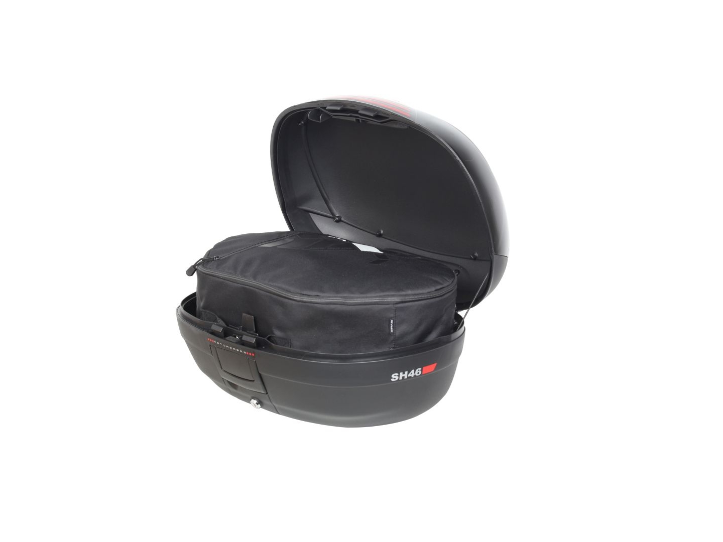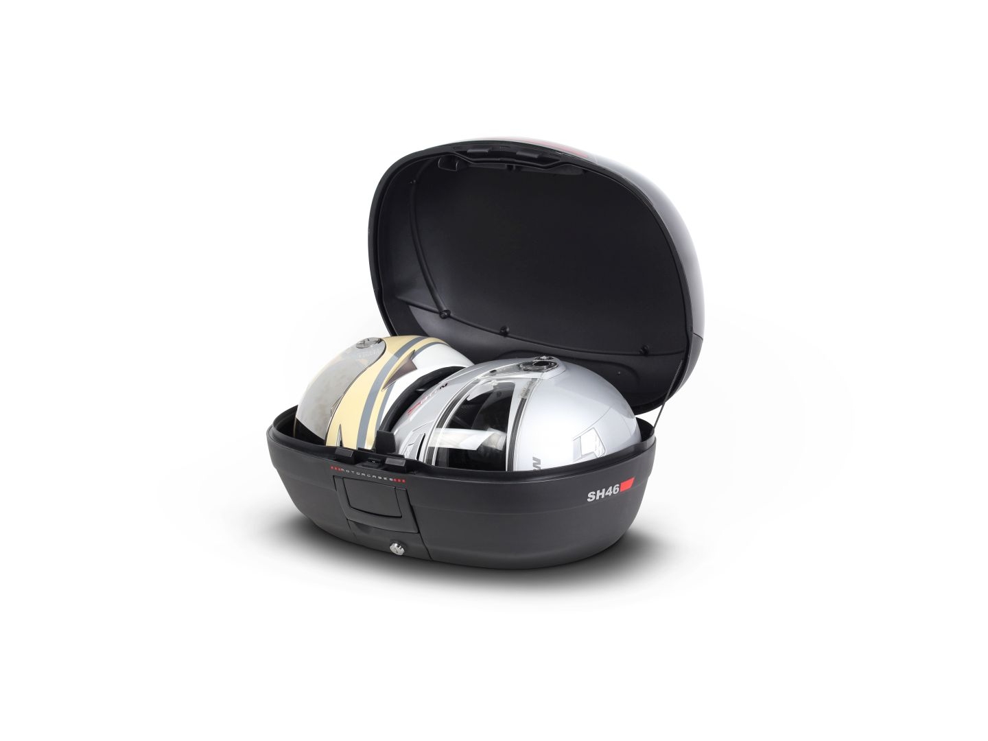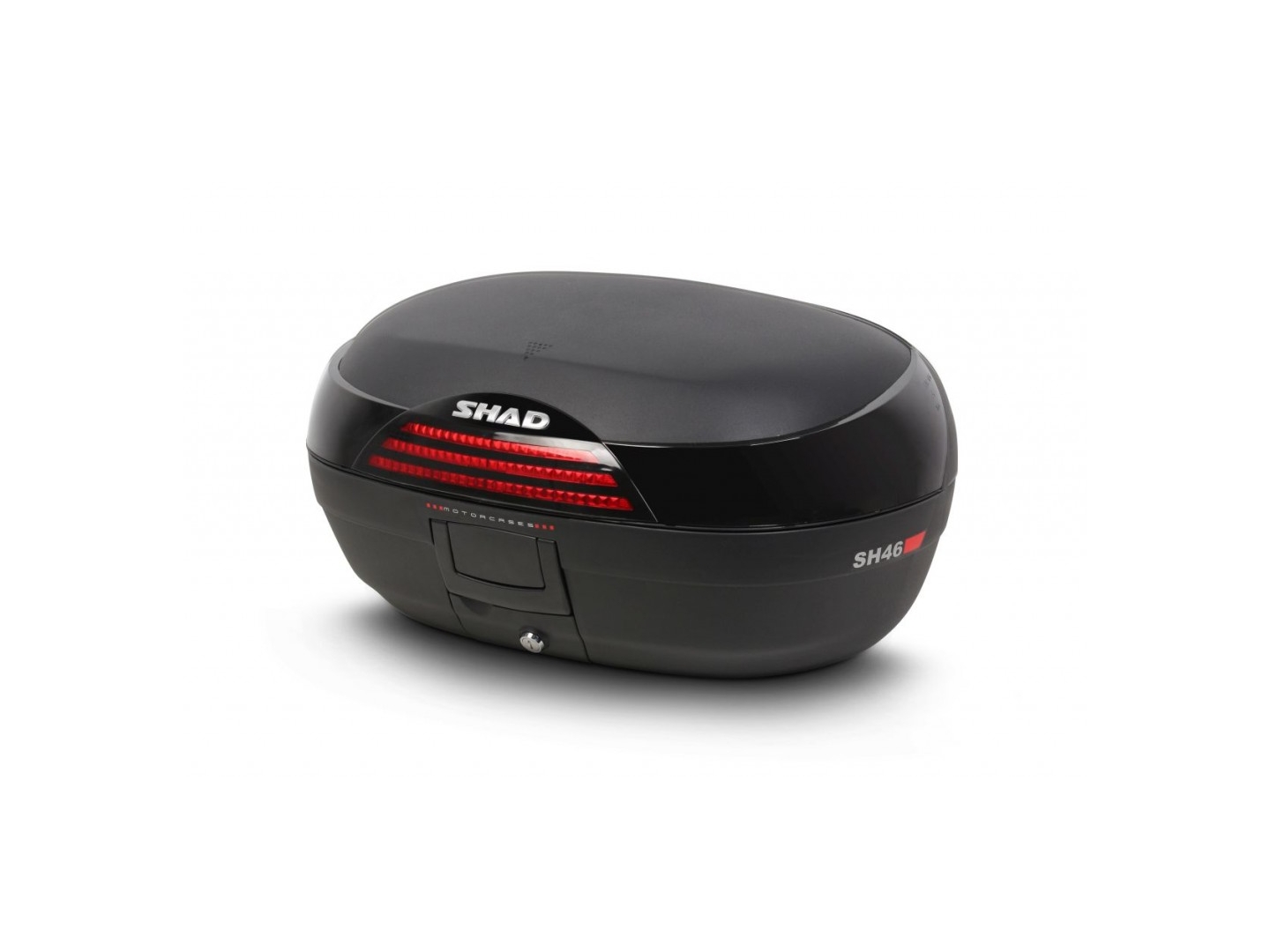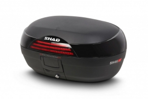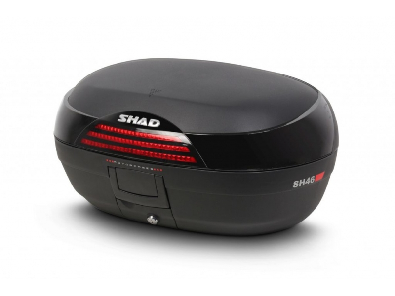 Vrchní kufr SH46 je robustní vrchní kufr vyrobený z vysoce kvalitního tvrzeného polypropylenu. Tento kufr je schopný odolat extrémním teplotám, sněhu i dešti a zároveň chrání obsah před nárazy a poškozením. Má objem vhodný pro 2 integrální helmy plus další cestovní vybavení. Má zaoblené tvary a 3 řady červených odrazek na černém pozadí. Má ideální velikost pro jízdu po městě ale i na delší výlety a je proto vhodný jak na skútry tak na střední i větší motorky.